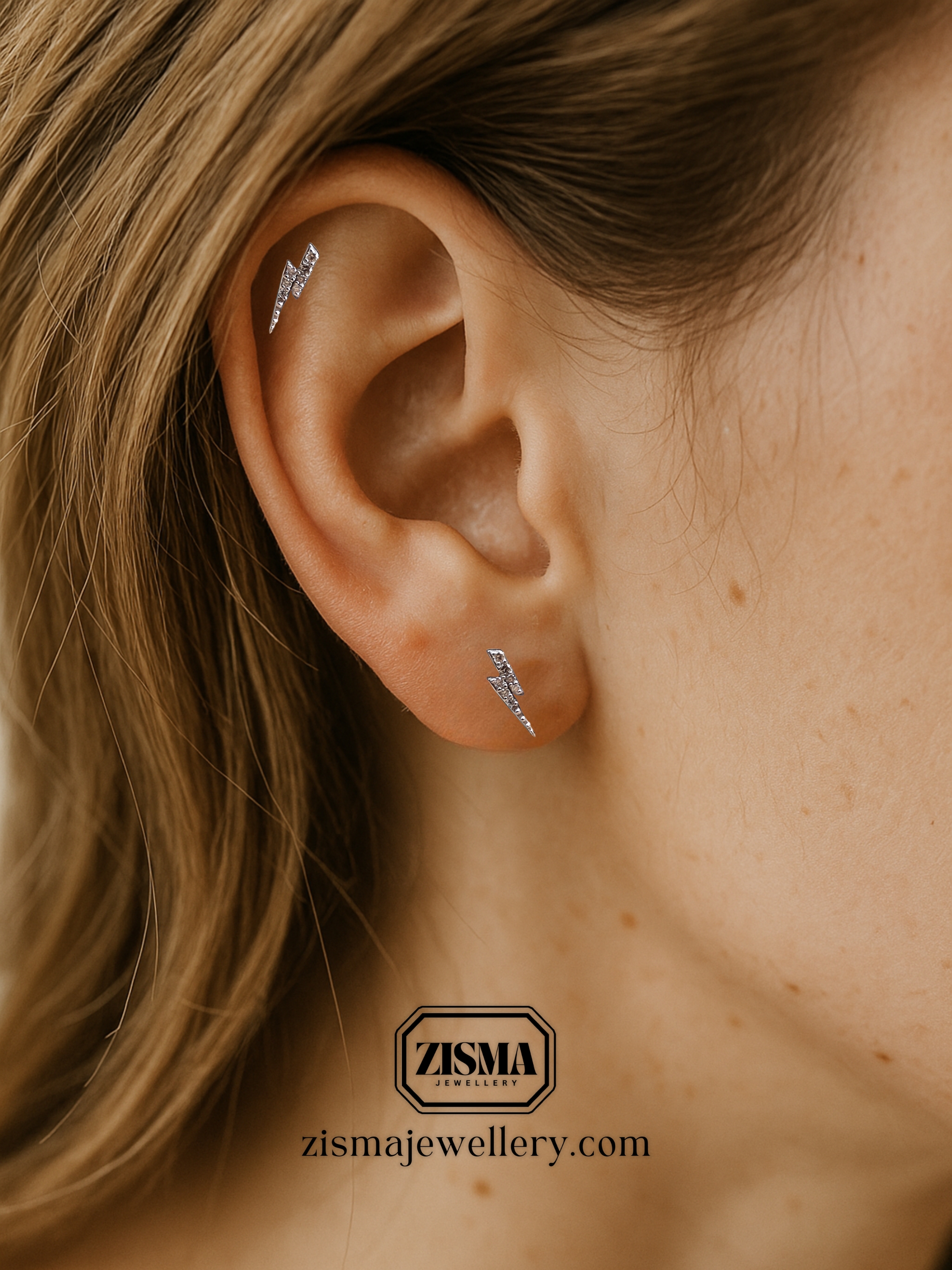 diamond studs thunder bolt earrings 14K white gold minimalist earrings
